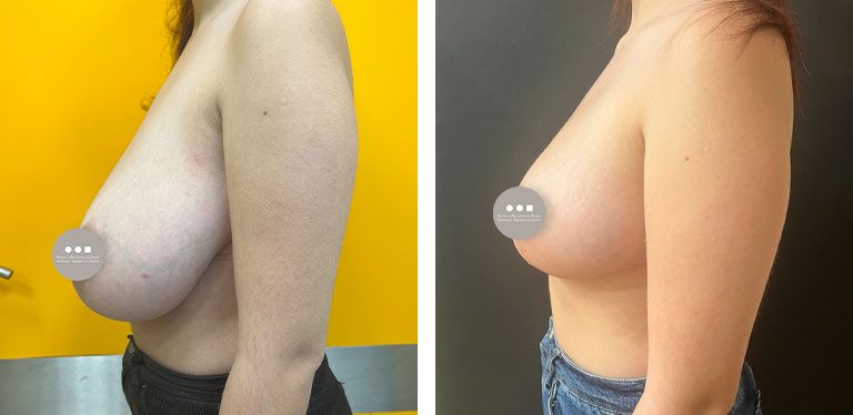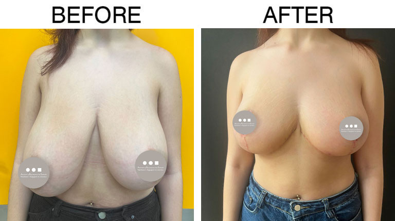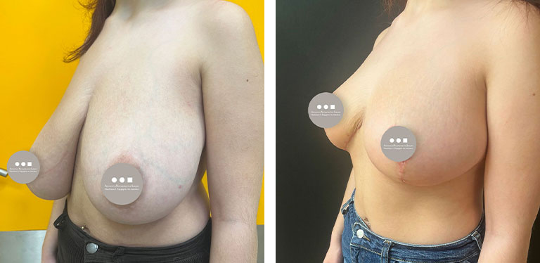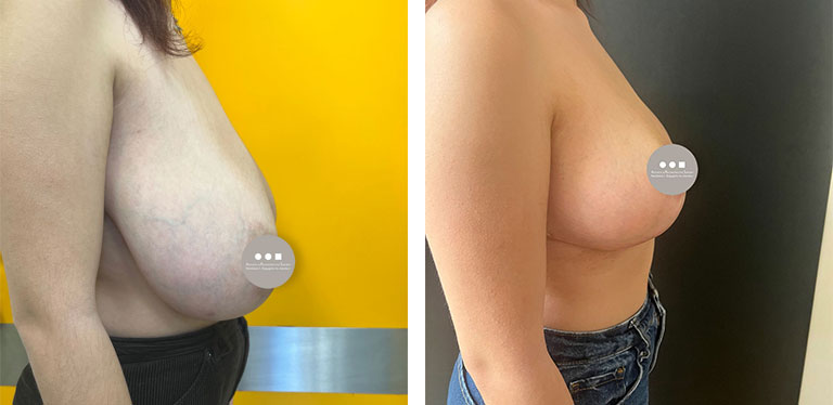 Η 22χρονη ασθενής προσήλθε στο ιατρείο μας έχοντας έναν ιδιαίτερα μεγάλο και πτωτικό μαστό που είχε χάσει το σχήμα του. Το μεγάλο βάρος του στήθους δημιουργούσε προβλήματα στην καθημερινότητά της ακόμα και στις πιο απλές δραστηριότητες, όπως το γυμναστήριο, αλλά και μυοσκελετικά προβλήματα με πόνο στον αυχένα, λόγω βάρους και κακής στάσης σώματος. Προχωρήσαμε σε επέμβαση μειωτικής στήθους, προκειμένου να αφαιρέσουμε περίπου 850gr από κάθε στήθος, να ανορθώσουμε τον εναπομείναντα μαστό και να επανατοποθετήσομε τη θηλή στη φυσιολογική της θέση. Το αποτέλεσμα είναι ένα μήνα μετά την επέμβαση. Οι τομές έχουν ήδη μια πολύ καλή εικόνα και θα βελτιωθούν ακόμη περισσότερο όσο ολοκληρώνεται η επούλωση.